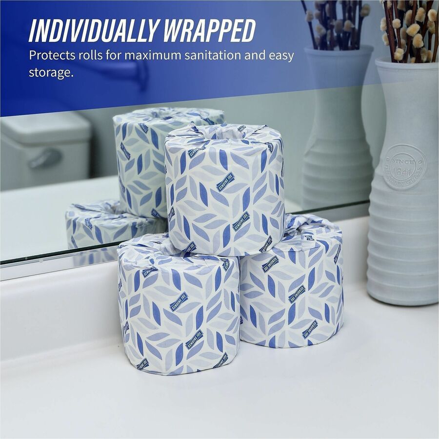 Embossed bath tissue offers two-ply sheets that are securely overall-wrapped for maximum sanitation. Perforated tissue offers exceptional whiteness, absorbency and softness and is suited for restroom applications. Each roll fits standard-roll, bathroom-tissue dispensers. Bathroom tissue is safe for sewer and septic systems.